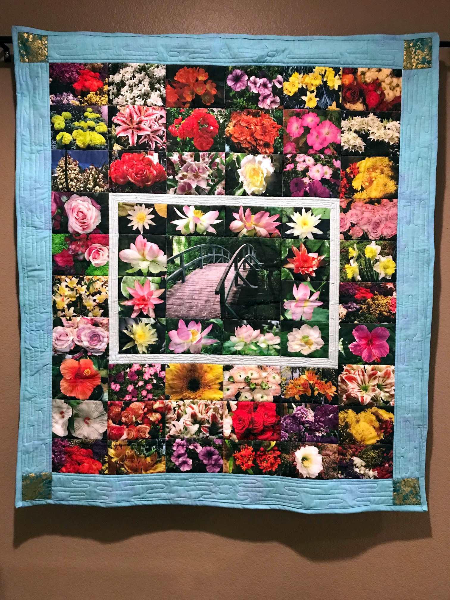 This quilt is made up from the photos of flowers that I have taken over the years. The images of the water lilies, Lotuses and the walkway in the center block of the were taken at the Grounds For Sculpture in Hamilton Township, NJ.