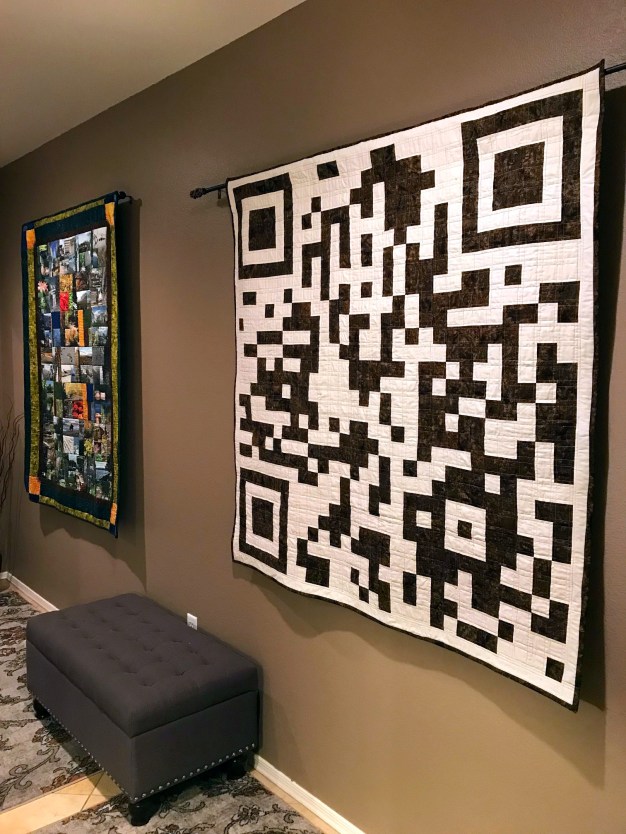 The first of my Geo series is called the QR quilt a working quilt because the quilt actually does something, if you have a smart phone with a QR (Quick Response) Reader app and you take a look at the quilt with that app, it will send you to my Art Quilts of Nevada website.